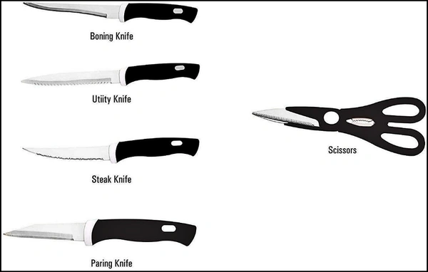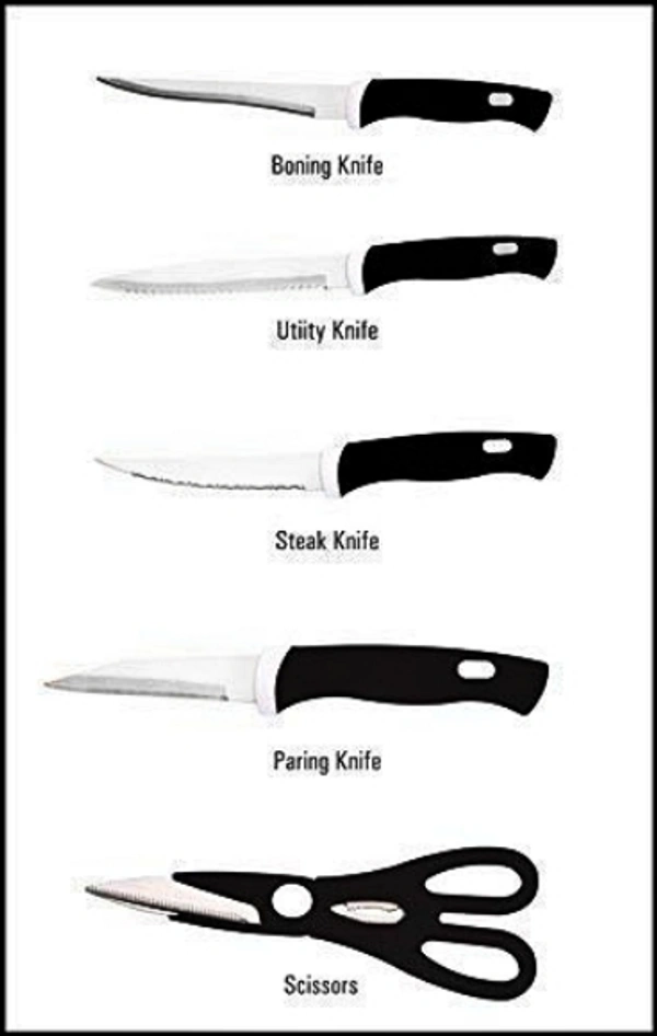 - Material: Plastic and Tempered Steel Package Contents: 5-Pieces Kitchen Knife Set