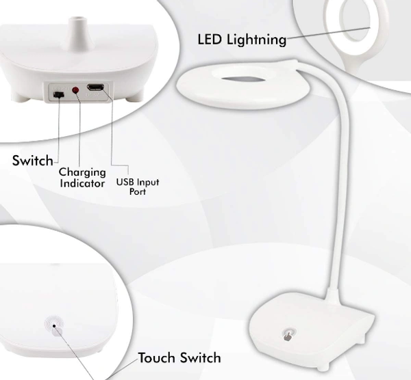 Rechargeable LED Desk Lamp One-touch On/Off Switch Student Study Reading Learning Dimmer / Brightener Rechargeable Led Table with Children Eye Protection Lamps (White)
