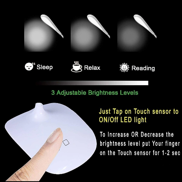 - Made of ABS, lightweight, durable and smooth texture feeling. The lamp has 3 level of brightness (High-medium-low).Easy to turn on and off in 2 seconds by touch-sensitive controller..