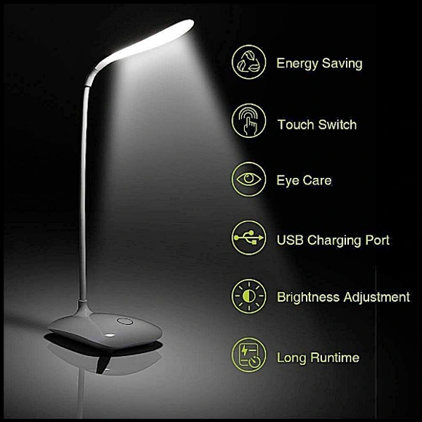 - Type:Desk Lamps Brightness: Long press for increase and decrease brightness of led Modes Adjustable Power: 1.5 W Power supply: USB power supply Line length: 25 cm Size:Height 35cm,base width 10cm,lamp length 13cm Material:ABS.