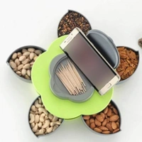 - > Creative flower candy box plum blossom rotating fruit bowl with mobile phone holder dried fruit box. Brand new and high quality Made with healthy ABS material. non-toxic and environmental protection Five kinds of candies, nuts or other snacks Can also be a decoration in your living room Rotate to open or close